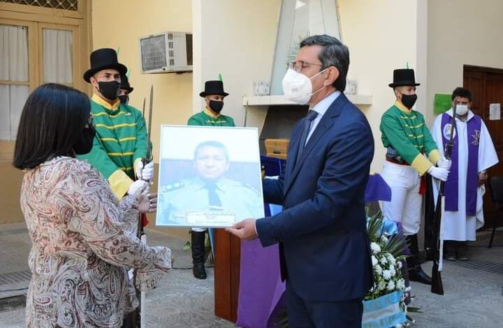 Luego, se realizó una invocación religiosa a cargo del Capellán de la Institución, Guillermo Danuso, tras lo cual se guardó un minuto de silencio con una formación especial que le rindió honores. Finalmente, se entregó un cuadro con la foto del Comisario Mayor Martínez a su esposa y una Bandera Nacional a sus hijos.