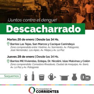 Durante esta semana el operativo de descacharrado se realizará el martes 26 en los barrios: Las tejas, San Marcos y Cacique Canindeyu. En tanto que el jueves 28 se extenderá hacia los barrios 1000 viviendas, Estepa, Nicolini, Islas Malvinas y Colón.