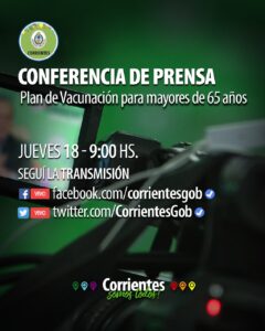 Este jueves a las 9, el ministro de Salud, Ricardo Cardozo presentará el Plan Provincial de Vacunación para personas mayores de 65 años, en el marco de la lucha contra la pandemia del Coronavirus. Será en el Salón Verde de Casa de Gobierno, mediante una conferencia de prensa, transmitida en vivo desde las cuentas oficiales Gobierno de Corrientes en Facebook y Twitter.