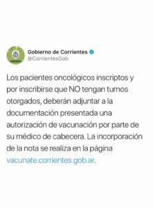 El gobierno de la Provincia informó que los pacientes oncológicos inscriptos y por inscribirse que no tengan turnos otorgados, deberán adjuntar a la documentación presentada una autorización de vacunación por parte de su médico de cabecera. Además, la incorporación de la nota se realiza en la página vacunate.corrientes.gob.ar