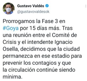 Mediante su cuenta de twitter, el gobernador Gustavo Valdés, informó que la ciudad de Goya se mantiene en fase 3 de aislamiento social, preventivo y obligatorio para hacer frente a la pandemia del Coronavirus. Esta medida se extiende por el lapso de 15 días.