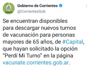 El Gobierno de Corrientes informó que «se encuentran disponibles para descargar nuevos turnos de vacunación para personas mayores de 65 años, de Capital, que hayan solicitado la opción “Perdí Mi Turno” en la página vacunate.corrientes.gob.ar«.
