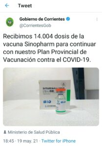El Gobierno de Corrientes anunció por medio del Twitter oficial (@CorrientesGob), que llegaron 14.004 dosis de la vacuna Sinopharm para continuar con el Plan Provincial de Vacunación contra el COVID-19.