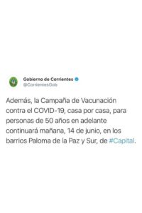 Se recuerda además que “la Campaña de Vacunación contra el COVID-19, casa por casa, para personas de 50 años en adelante continuará mañana, 14 de junio, en los barrios Paloma de la Paz y Sur, de Capital”.