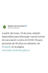 El gobierno de Corrientes informó a través de las redes sociales que a partir del hoy lunes, 14 de junio, estarán disponibles para descargar nuevos turnos de vacunación contra el COVID-19 para personas de 40 años en adelante, de Capital, en la página vacunate.corrientes.gob.ar
