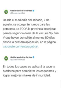El gobierno de Corrientes informó a través de su cuenta de Twitter que desde el mediodía del sábado 7 de agosto, se otorgarán turnos para las personas de toda la provincia inscriptas para la segunda dosis de la vacuna Sputnik V que hayan cumplido al menos 60 días desde la primera aplicación, en la página www.vacunate.corrientes.gob.ar