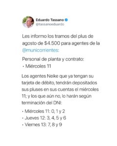La Municipalidad de Corrientes efectivizará desde este miércoles 11 el pago del plus de 4.500 pesos para todo el personal (trabajadores Neike, contratados y planta permanente). El anuncio fue dado a conocer por el intendente Eduardo Tassano a través de sus redes sociales.