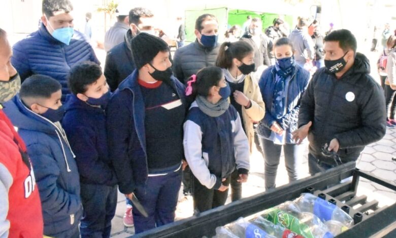 Durante la jornada, alumnos de primaria y vecinos participaron del taller sobre prensado de plásticos PETs., a cargo de la Dirección de Organización y Comunicación Comunitaria cuya titular es la Prof. María Eva Guerra de la cartera social, se trata de una experiencia de trabajo comunitario con el objeto de concientizar sobre la importancia del reciclado.