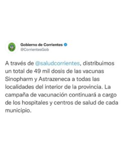 Mediante su cuenta de twitter, el Gobierno de Corrientes comunicó que a través del ministerio de Salud Pública, se distribuyeron un total de 49 mil dosis de las vacunas Sinopharm y Astrazeneca a todas las localidades del interior de la provincia.