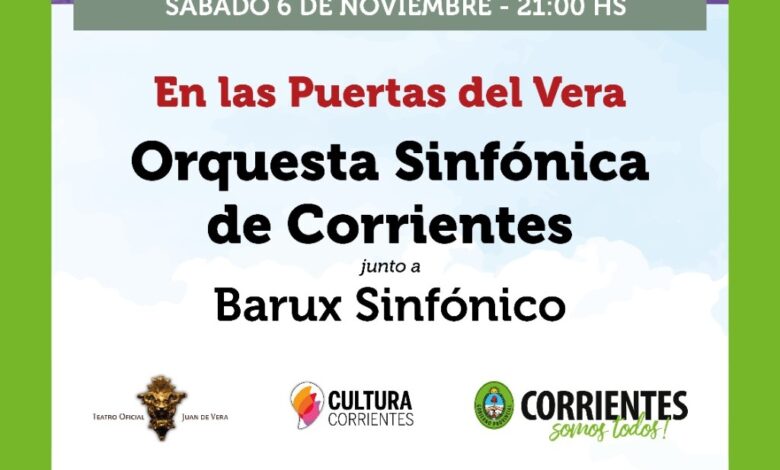 Un concierto electrónico y sinfónico al aire libre, tendrá lugar el sábado 6 a las 21, en las escalinatas del Teatro Oficial Juan de Vera, que, de esta manera, cumplirá con otra entrega del ciclo gratuito “En las puertas del Vera”. El espectáculo, Barux Sinfónico, tendrá como protagonistas a la Orquesta Sinfónica de Corrientes dirigida por Andrea Fusco y a Barux (del Chaco). Acceso gratuito.