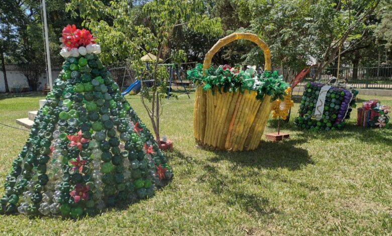 La construcción de un árbol de navidad, una canasta y dos cajas de regalos todo en tamaño gigante, fue hecho con botellas plásticas, lo que implicó un proceso, que se inició con la recolección de las botellas y la colaboración de muchas personas.