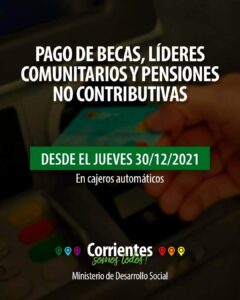 El Ministerio de Desarrollo Social de la provincia, informa a beneficiarios, que desde este jueves 30 de diciembre de 2021, estará disponible el pago de BECAS, Pensiones No Contributivas y Líderes Comunitarios dependientes de este organismo.
