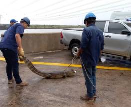 Un ejemplar de yacaré overo (caimán latirostris), fue divisado y rescatado aguas abajo de la central hidroeléctrica Yacyretá, en frente del canal de atracción de peces. La tarea de rescate estuvo a cargo de funcionarios del área gestión ambiental del departamento técnico de la EBY.