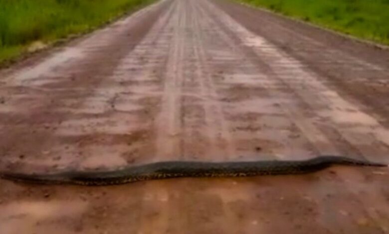 Una curiyú gigante, o anaconda amarilla (Eunectes notaeus) sorprendió a un hombre en el medio de un camino rural en la provincia de Corrientes. Decidió grabar un video del animal manso que se volvió viral en las redes sociales.