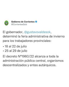 El gobernador Gustavo Valdés rubricó el decreto N°1960/22, el cual establece la feria administrativa de invierno para los trabajadores provinciales, del 18 a 22 de julio y del 25 a 29 del mismo mes.