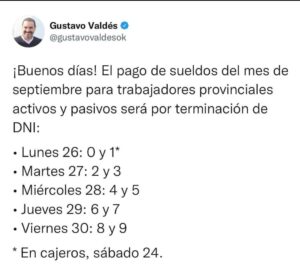 A través de su cuenta de Twitter, Gustavo Valdés informó los días de pago, correspondiente a los haberes de trabajadores provinciales -activos y pasivos-. Como es de habitual manera, se llevará adelante por terminación de DNI.