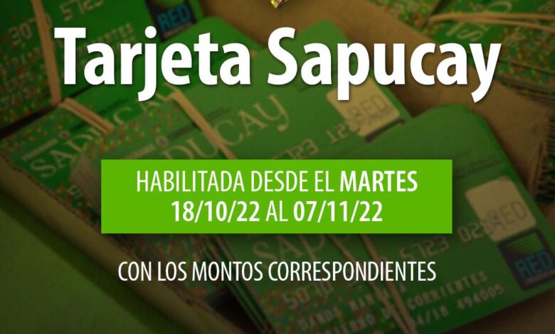 El Ministerio de Desarrollo Social del Gobierno de Corrientes informa a los beneficiarios del Programa que las Tarjetas Sapucay desde este martes 18 estarán habilitadas hasta el 7 de noviembre.
