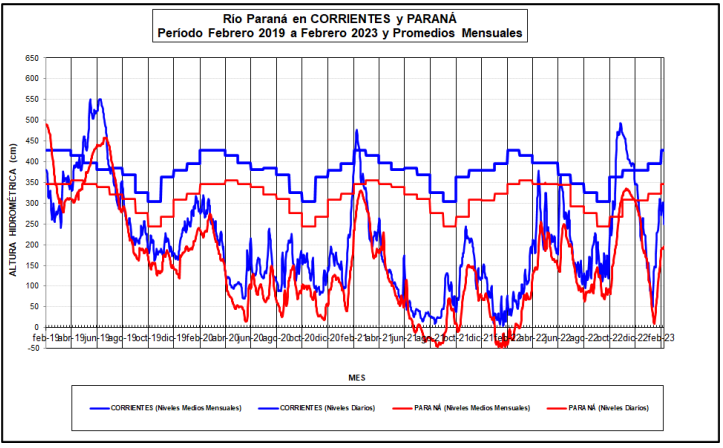 En la sección superior del tramo (Corrientes – La Paz) el nivel hidrométrico comenzó a descender levemente, por leve disminución del derrame de Yacyretá. En efecto, las medias semanales permanecen 1,26 metros aproximadamente por debajo del promedio de febrero de los últimos 25 años en Corrientes y Barranqueras siendo el mismo 1,10 metros inferior en Goya.