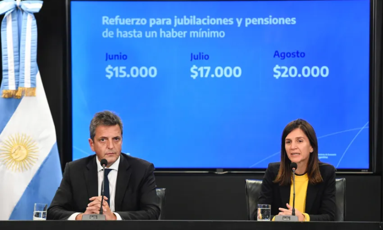 La directora ejecutiva de ANSES, Fernanda Raverta, y el ministro de Economía de la Nación, Sergio Massa, anunciaron hoy el aumento del 20,92 por ciento correspondiente a la Ley de Movilidad y un refuerzo para las jubilaciones y pensiones mínimas de 15 mil pesos en junio, 17 mil pesos en julio y 20 mil pesos en agosto.