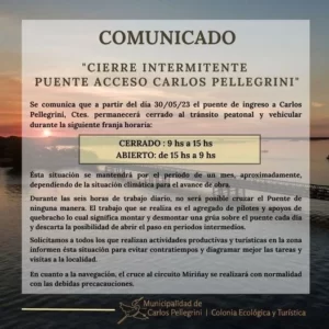 La Municipalidad de la localidad correntina de Carlos Pellegrini informó que a partir del 30 de mayo el puente de acceso a la localidad permanecerá cerrado al tránsito peatonal y vehicular en franjas horarias durante un mes debido a diversas obras.