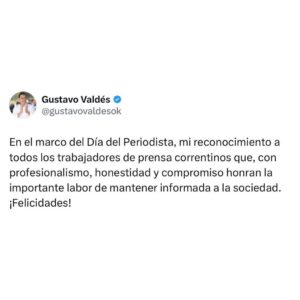 El gobernador Gustavo Valdés este miércoles, a través de su cuenta de Twitter @gustavovaldesok, en el marco del Día del Periodista, expresó su salutación a quienes se desempeñan en dicha profesión diariamente.