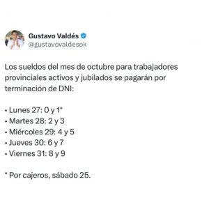 A través de sus redes sociales, @gustavovaldesok, comunicó el pago del sueldo de octubre a los agentes de la administración pública provincial, activos, jubilados y pensionados. El cronograma se extiende entre este lunes 27 y el viernes 31.