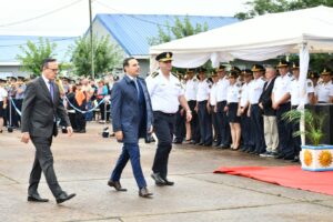 “La seguridad es símbolo y sinónimo de paz en la vida cotidiana de nuestra gente”, dijo con énfasis el gobernador Gustavo Valdés al dirigirse a los presentes en el acto, destacando la importante inversión hecha hacia la Policía de Corrientes, traducida en tecnología, incorporando el sistema 911, cámaras, lectores de patentes y faciales., también el uso de la Inteligencia Artificial, con padrones, bases, huellas y demás y en infraestructura mencionó las inauguraciones y refacciones para que los edificios y comisarías estén en condiciones. También, la incorporación de efectivos que permiten que “hoy estamos mejor preparados para proteger la seguridad, la integridad y los derechos de los ciudadanos de Corrientes”.