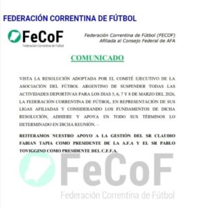 La Federación Correntina de Fútbol (FeCoF) informó oficialmente que adhiere en todos sus términos a la resolución adoptada por el Comité Ejecutivo de la Asociación del Fútbol Argentino (AFA), que dispone la suspensión de todas las actividades deportivas para los días 5, 6, 7 y 8 de marzo de 2026.