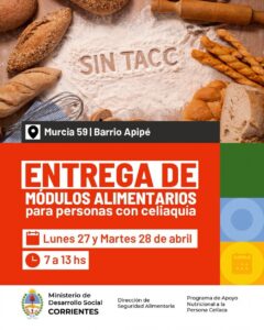 El lunes 27 la Dirección de Seguridad Alimentaria realizó la entrega de módulos para celíacos en el Depósito del Ministerio de Desarrollo Social sito en Murcia 59 del barrio Apipé, a beneficiarios del Programa de Apoyo Nutricional para Personas Celíacas. La entrega continuará el martes 28 de abril de 7 a 13 horas.